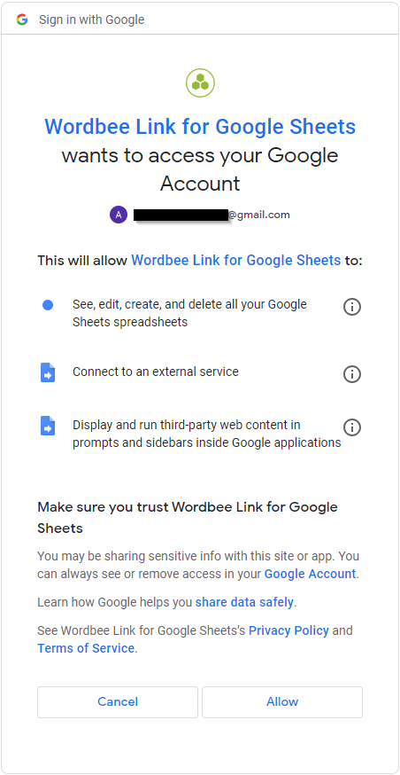 3. In order to synchronize Google Sheets™ with Wordbee Translator, we need your permission. Click Allow to continue with the installation. By doing so you accept our General Terms and Conditions as well as our Privacy Policy.