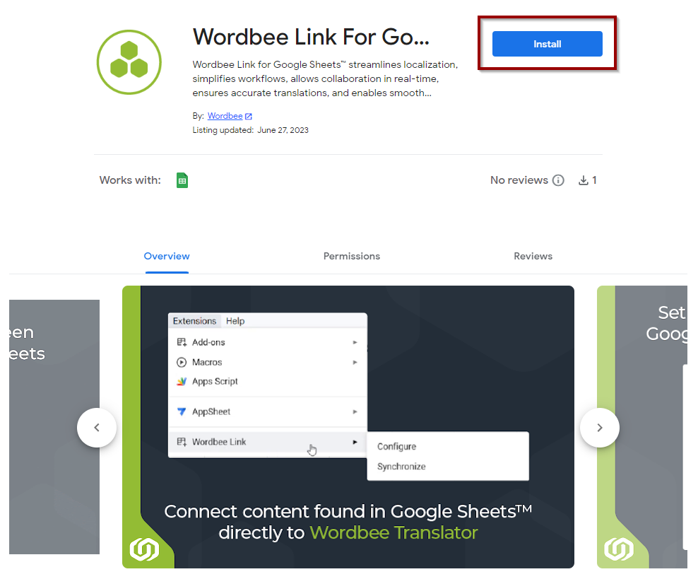 1. On the Wordbee Link for Google Sheets™ listing page, click on the Install button.