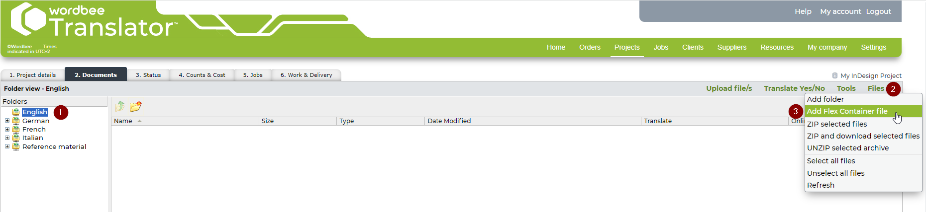 In order to connect an InDesign document to Wordbee Translator using the Wordbee Link for InDesign plugin you first need to create a Codyt project as well as a Flex container. A Flex container is a database to store incoming translation strings from connected systems. You can decide to send new content, delete content or change existing content from this database by synchronizing with the attached InDesign document.