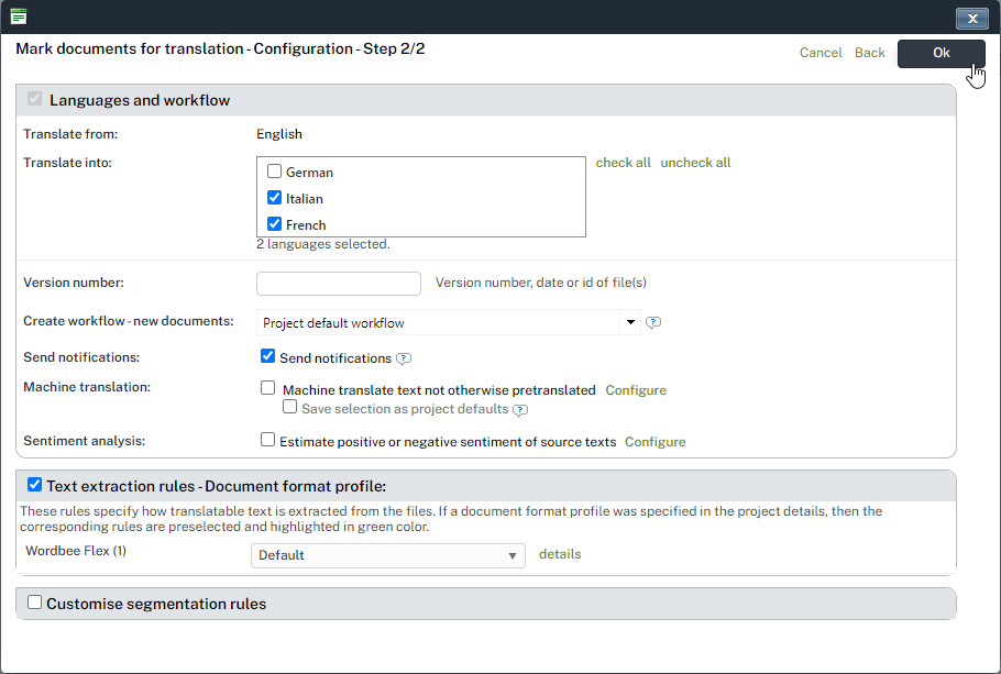 Set up the languages, the workflow and the text extraction rules for the Flex container and click “Ok”.