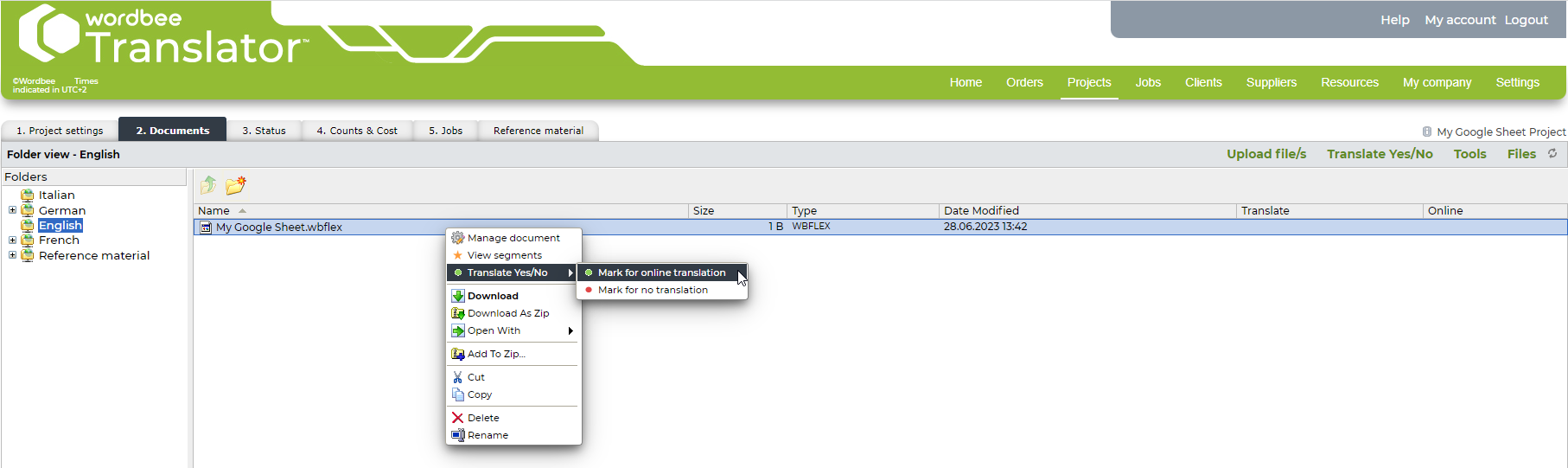 Right-click on the Flex container, hover “Translate Yes/No” and choose the option “Mark for online translation”.