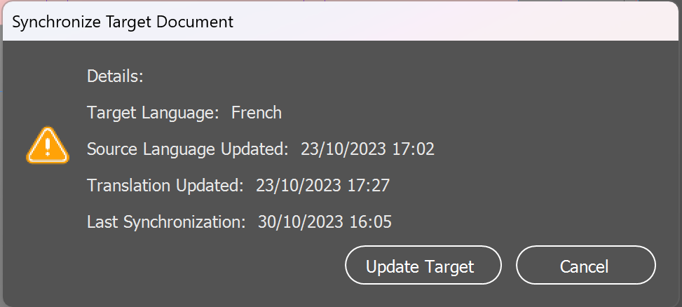Only the current Target Document will be synchronized, allowing each language team to define the right moment to do updates.