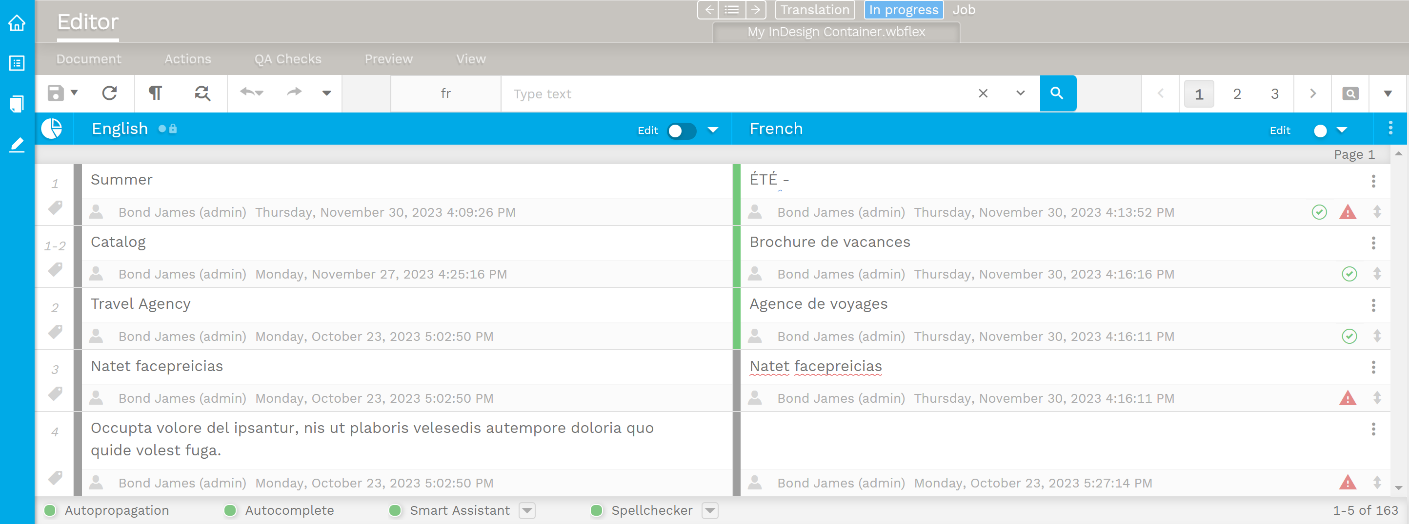 If the target document is created right after the source file is pushed, it is likely that no translations are available yet. In that case, the source text is kept as a placeholder while the translation work is in progress, so InDesign editors can work on the customization of the layout and styles of all assets in the file.