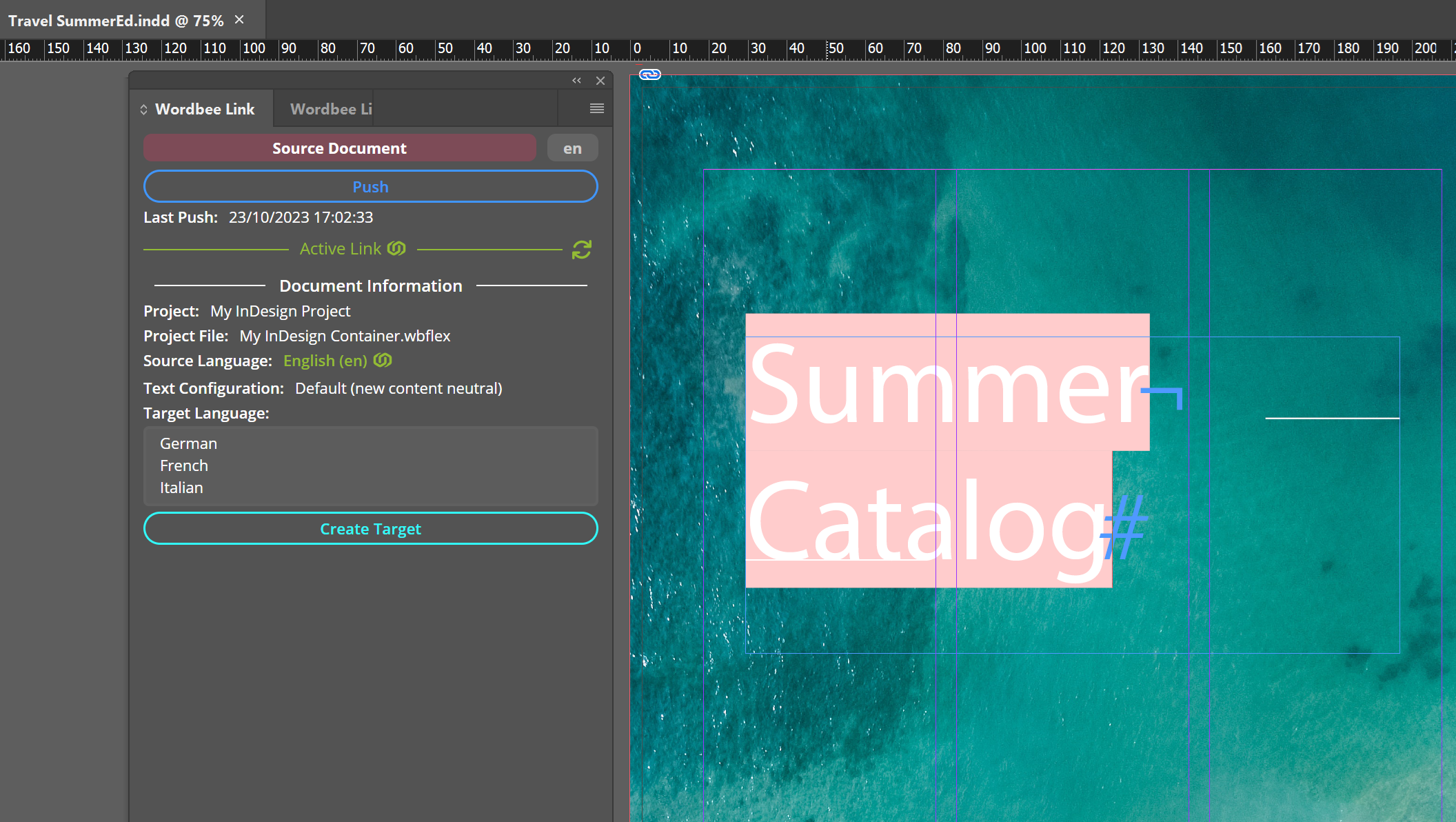 Once your InDesign file is linked to a Project File, you are ready to start your translation workflow. Simply click Push to send the current content of your InDesign file, including source text, layout and meta information, to Wordbee Translator.