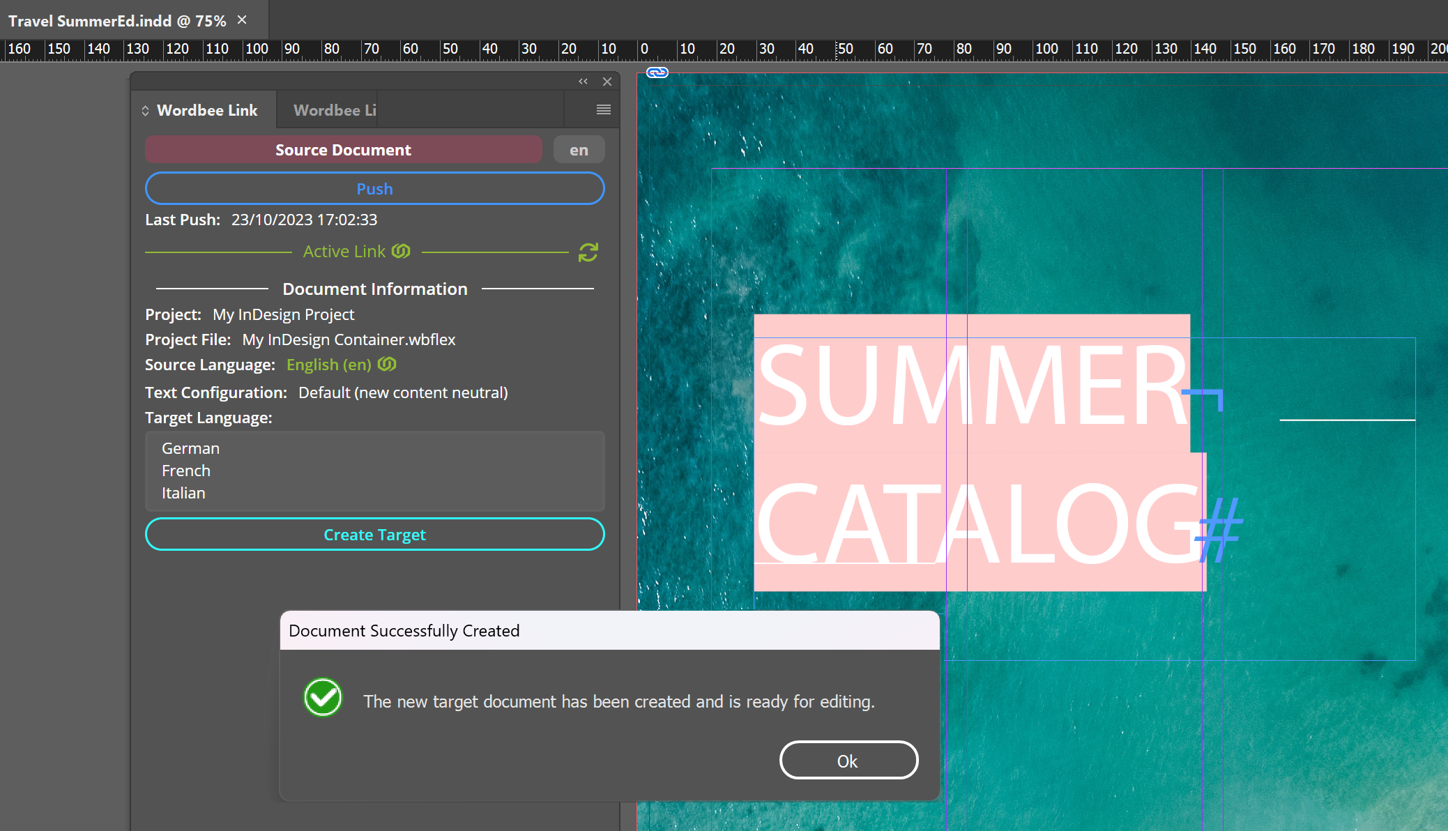 You can think of Target Documents as copies of the original source file that contain the translated text. They are created by the plugin based on the layout of the Source Document and the translations available in Wordbee Translator. With each push of the Source Document, text and layout changes are transferred to Wordbee Translator and can then be synchronized into each Target Document.