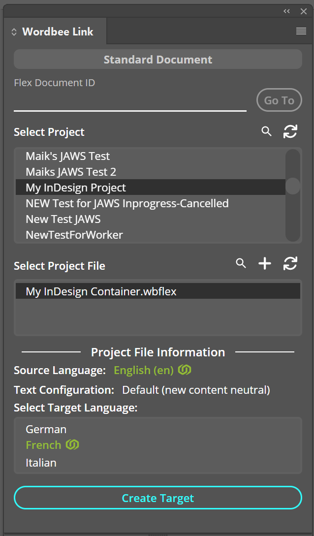 If you have your Source Document open, just make sure to open the Wordbee Link extension, select one of the target languages and click Create Target.