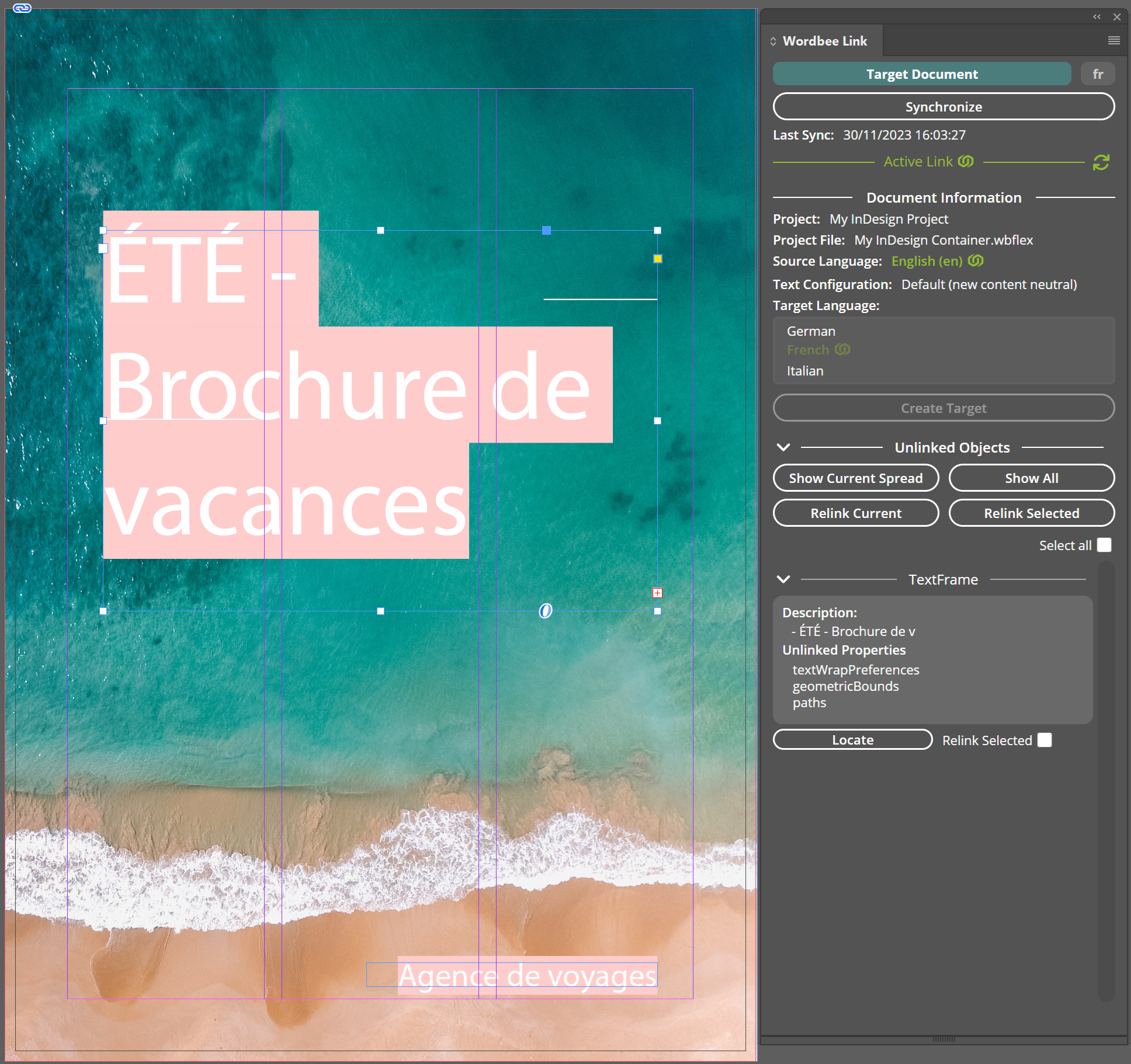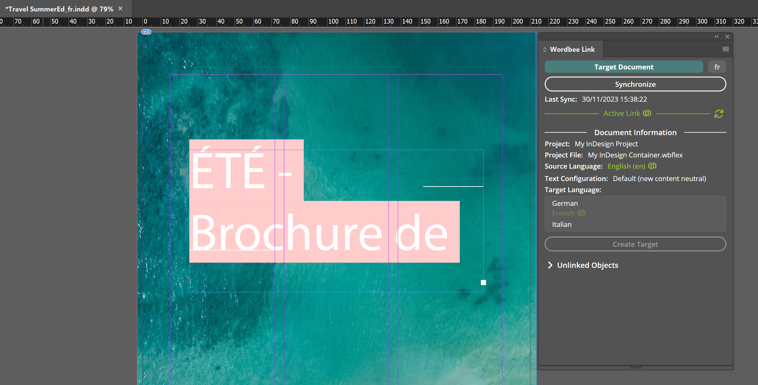 To fully localize your InDesign file you may need to resize text boxes, change the layout or images in a Target Document. Wordbee link for InDesign facilitates this on an object level. Whenever you make a layout change in the Target Document this object becomes an Unklinked Object and will no longer be fully synchronized with the source file.