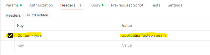 HTTP BODY | The contents of the file (byte array) to upload in binary mode, see Postman screenshot below. | Required |