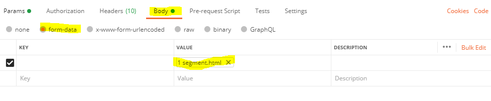 HTTP BODY | Include the binary stream of the document in the body of the HTTP POST request. | Required |