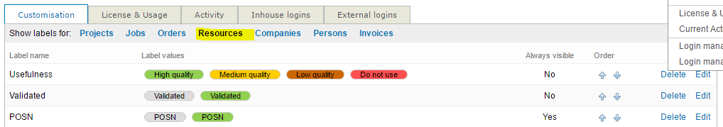 Segment level labels are defined in Wordbee Translator by clicking on "Settings" then "Labels" and finally "Resources":
