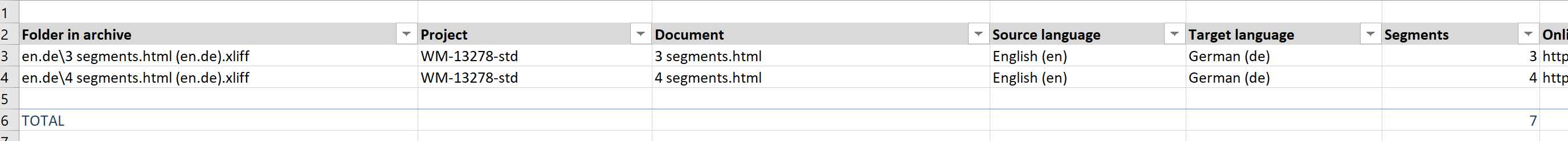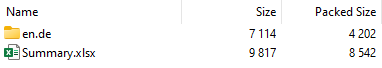 filetoken | The file token to download a ZIP archive with the exported XLIFF, Word or Excel files, the optional summary Excel and the optional TMX. The exported files are grouped in folders by their source/target languages. Usemedia/get/{token} to download the ZIP file. Example archive: ![]() The en.de folder contains all exported files for this language combination: ![]() The archive entries are the original file names plus the language combination appended at the end. The Summary.xlsx file (if option is enabled), lists the exported documents: ![]() | string |