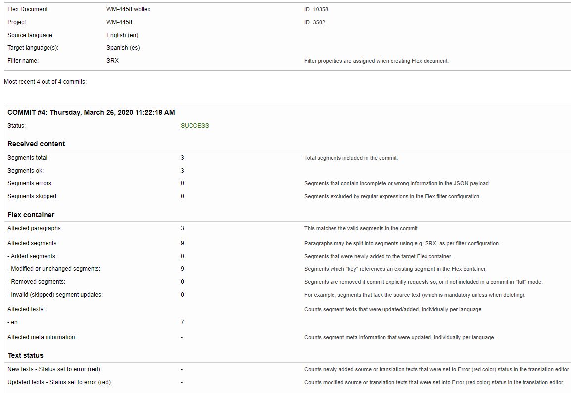 Wordbee Translator provides a user-friendly option to view the history of all commits/pushes to a Flex file. All these events are saved to a log file in JSON format.