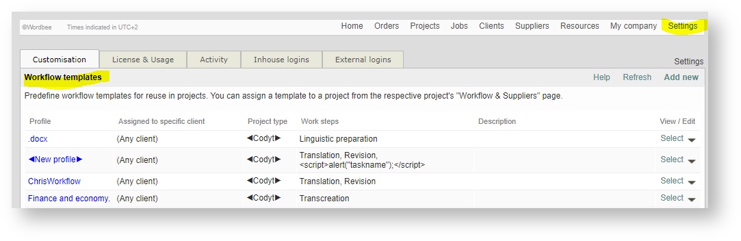 In Wordbee Translator, the profiles are viewed and edited from "Settings" and then "Workflow Templates":