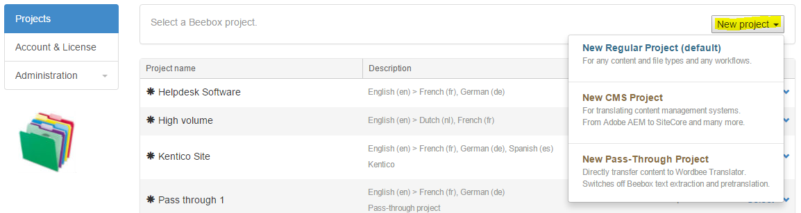 A Beebox project is the starting point to translate content or files: