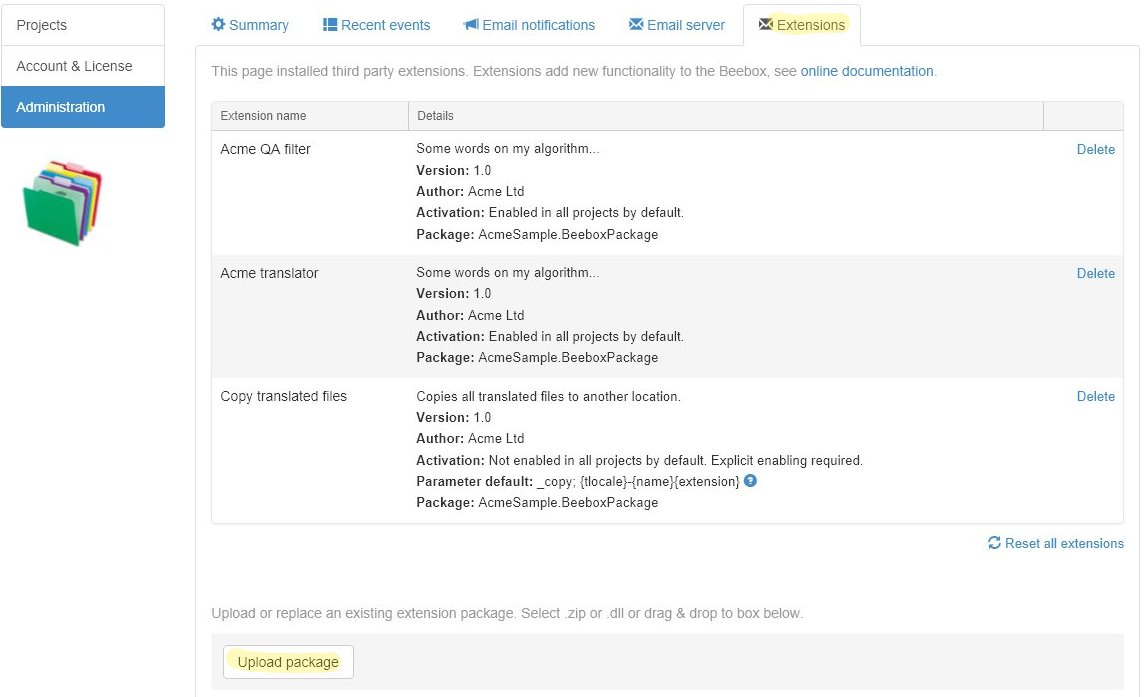 Once extensions are uploaded, the project settings page will show a new block of information at the bottom: