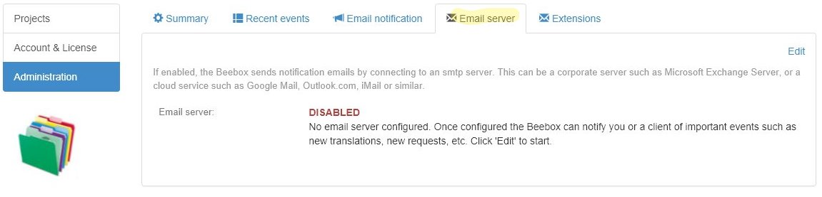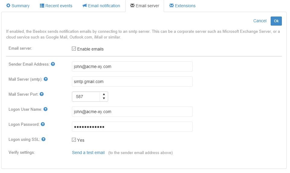 To have the Beebox send email notifications you first need to configure an email server. This can be your corporate server, Microsoft Exchange, Google Mail, Microsoft Live or others.