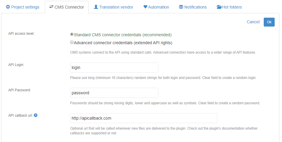 Use case: When you link a CMS with the Beebox, the CMS uses the limited "Connector" credentials to exchange work. If you would like to notify the CMS of work completed you may want to have a specific CMS page be called. That page may then notify a CMS user or trigger the download of translations.