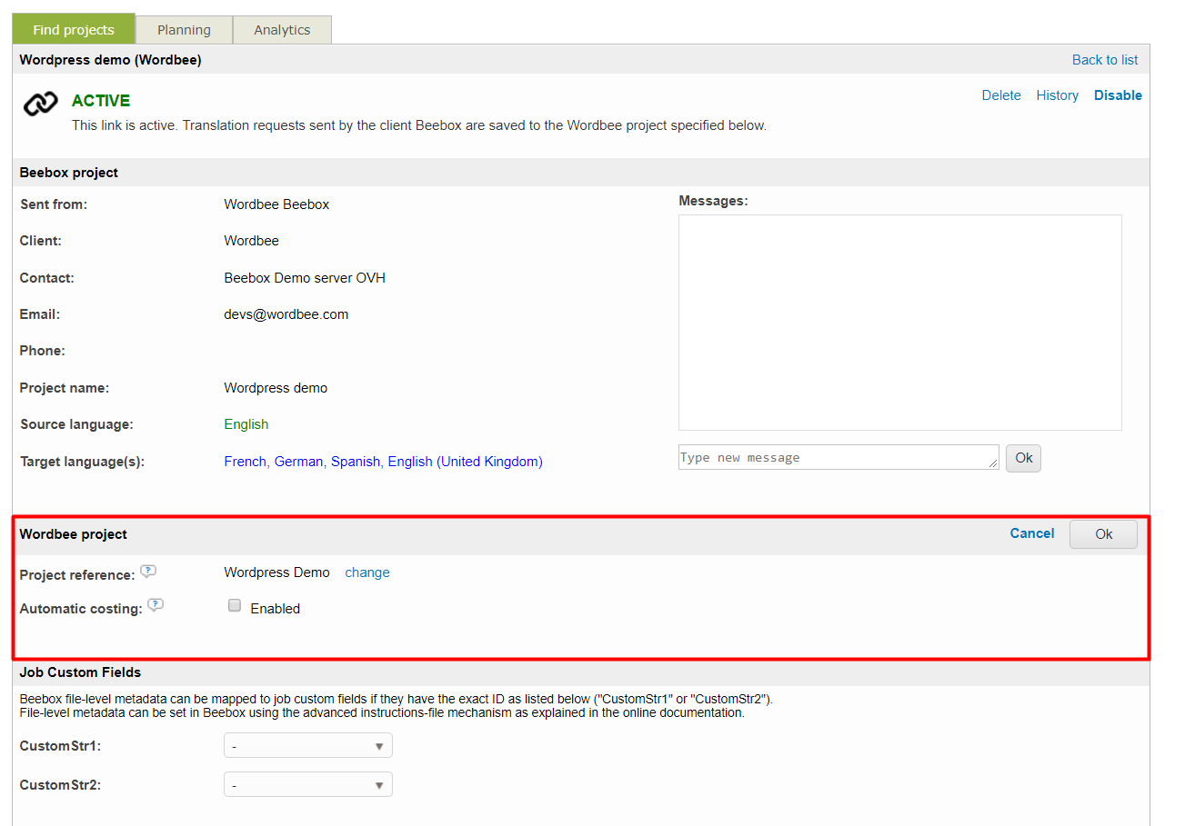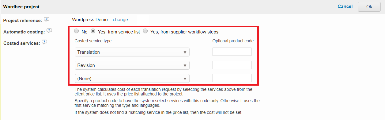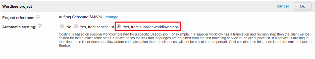 When you link a Beebox project to the Wordbee Translator TMS, you can enable automatic client costing for such a connection.