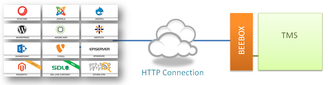 The diagram below shows how you translate one or more CMS by means of the Beebox and a Beebox connector. The latter is installed to the CMS and sends content to be translated to Beebox. Beebox will automatically receive and process those files. Translation jobs are then exported to Wordbee Translator or another TMS (using XLIFF files). Translated content is then sent back to the CMS.