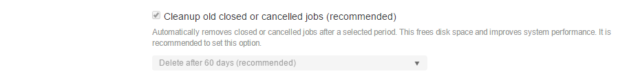 The option below lets you dispose of old and no longer required jobs. We recommend setting this option as keeping a large number of completed or cancelled jobs slows down overall system performance: