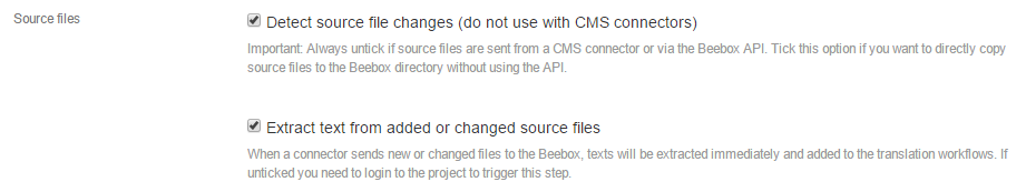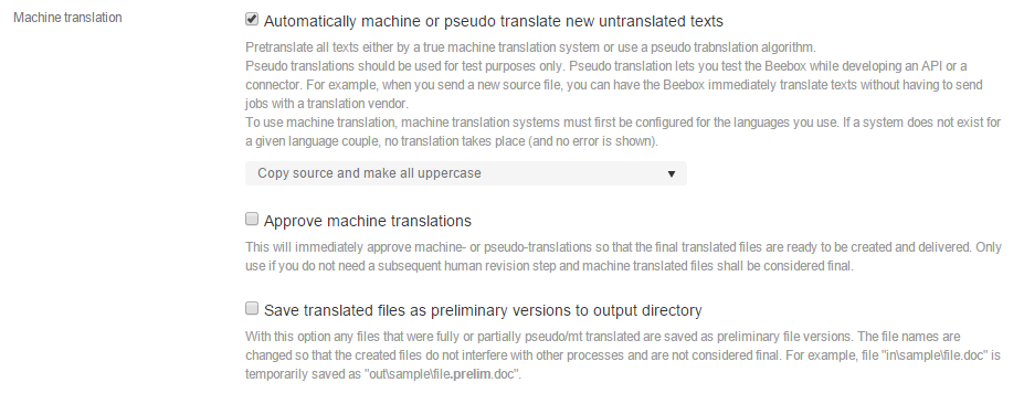 With new or changed files you can instruct the Beebox to translate any content not pretranslated from memories with a machine- or pseudo-translation system.