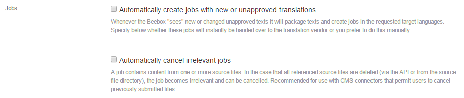 Jobs refer to human translation work. Translations that are not approved at this workflow stage can automatically be sent to a translation team, a Wordbee Translator platform or a third party TMS.