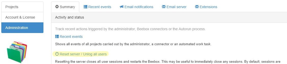 - Click the Reset Server link on the Administration page for changes to take effect: