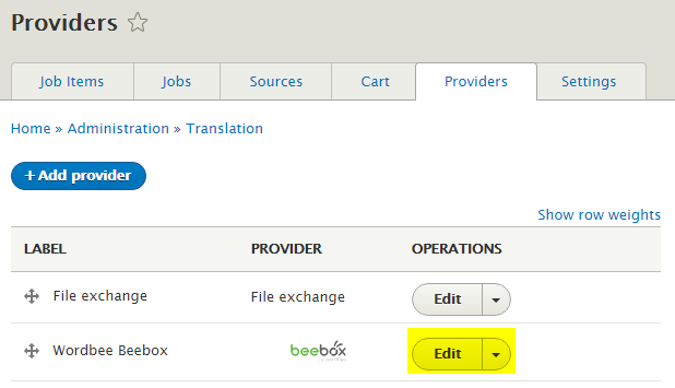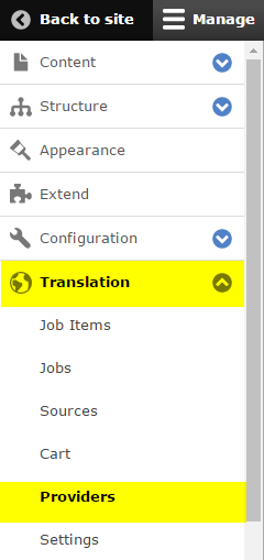 - Go to the TMGMT Providers list. To access it, go first to Translation, then Providers.