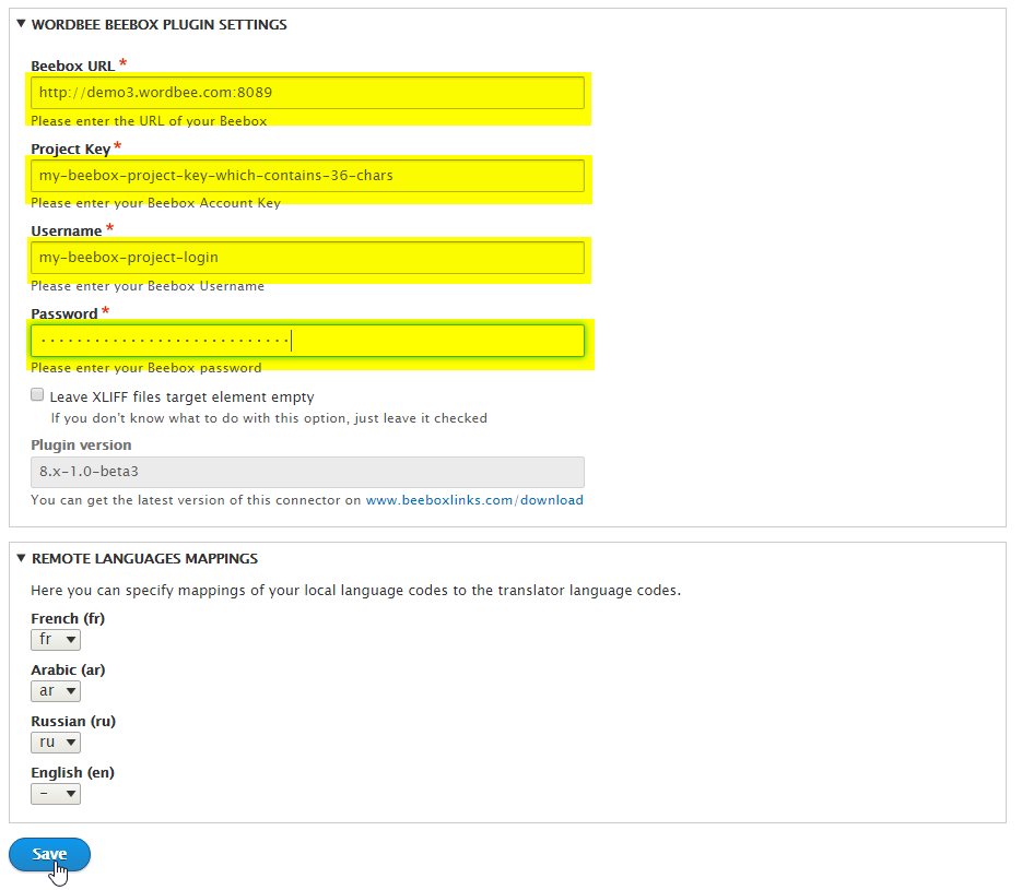 Please note the remote languages mapping fields are empty by default and will change to a select box as soon as the Beebox is connected properly.