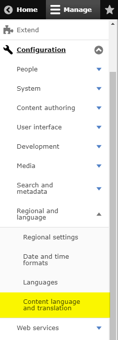 - The configuration is available in Content language and translation. To access it, go first to Configuration, then Regional and language.
