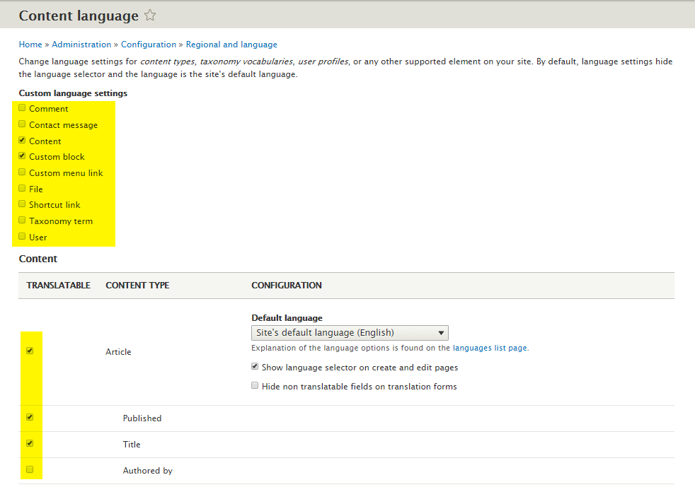 Before going ahead with translations, you need to configure what content type and fields are translatable.