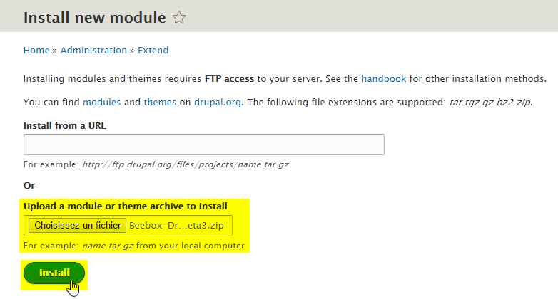 - Then, select your Beebox-Drupal-Connector.zip file and install it.