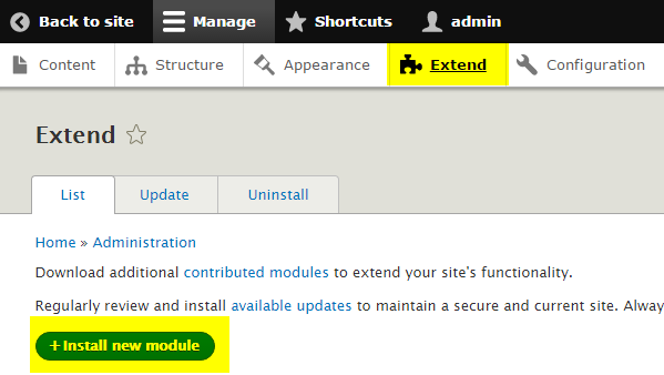 - Go to the administration area, and select Extend on the menu.