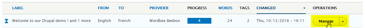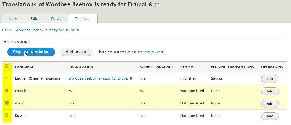Add to cart : Add the elements to a cart. Then, you can easily select content from different sources / pages. Please refer to the Cart section of this documentation for more information. - Select Wordbee Beebox (or the name of your Beebox configuration) as a translation provider, the target language you want and Submit to provider.