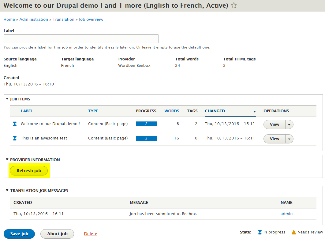 If you are using Drupal 7, 8, refresh the status of the job by clicking Refresh job.