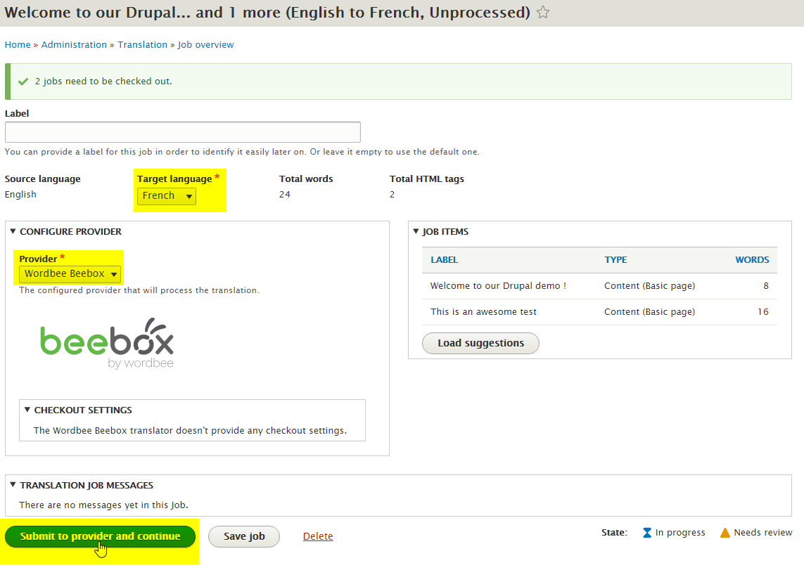 - Select Wordbee Beebox (or the name of your Beebox configuration) as a translation provider, the target language you want and Submit to provider.