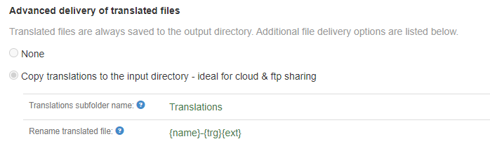 Optionally, you can have the translated files be renamed. In the example above we translate “myfile.html” into “myfile-es.html” etc.
