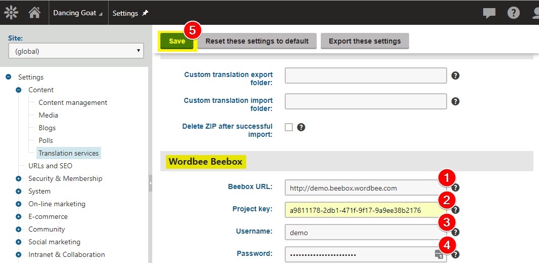 - Select Wordbee Beebox in the translation service list and edit it by clicking on the green pen action.