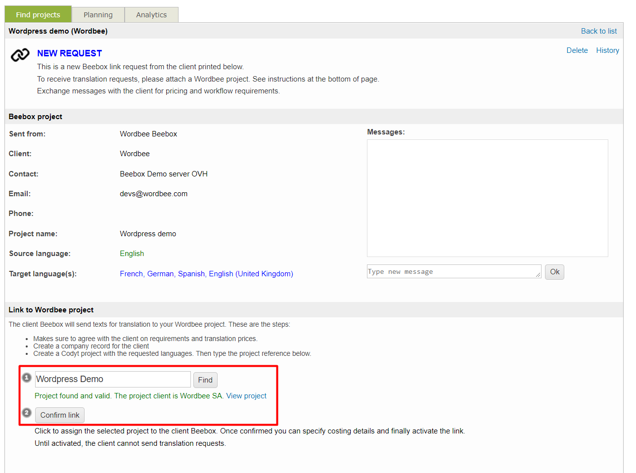 - In the Projects > Beebox links page the new link request is shown: