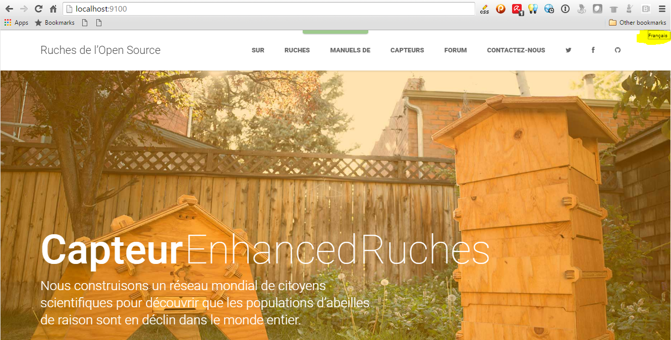 Now we connect to our Beebox server on port 9100. This is our home page with our French translations: