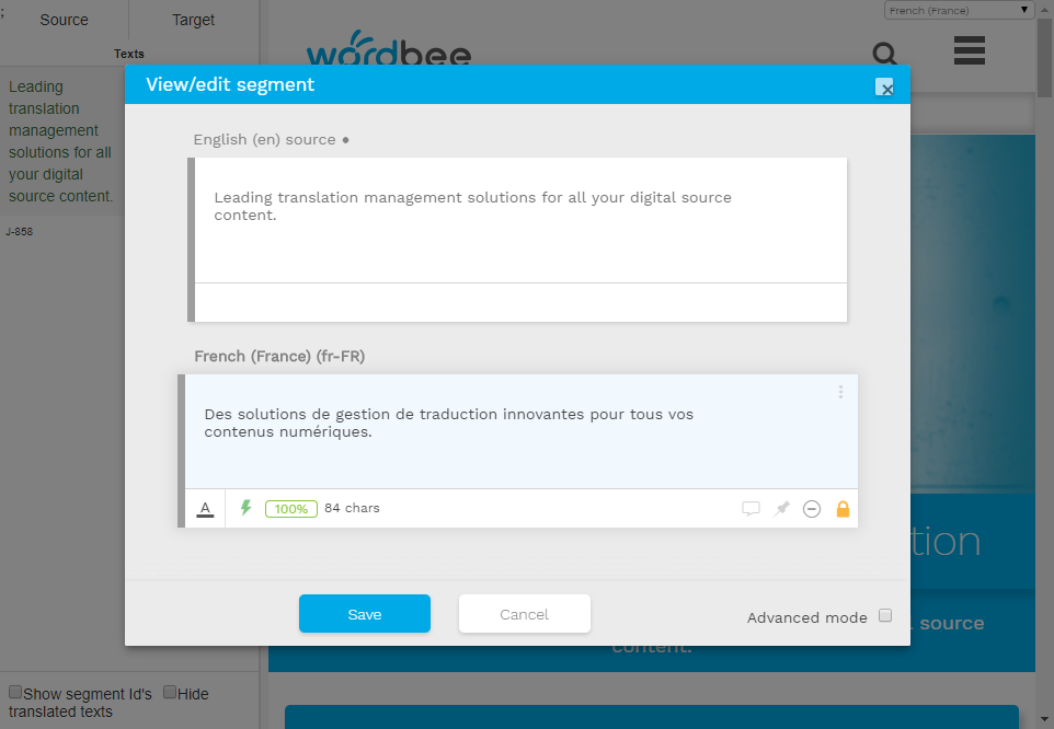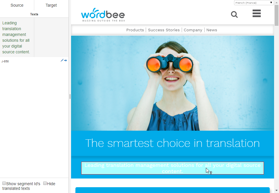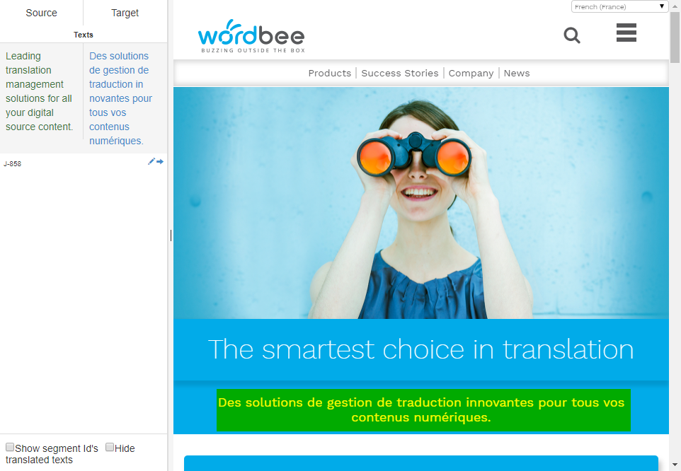If your Beebox project is linked to a Wordbee Translator platform, it is possible to proof-read and correct your translations directly from Live Preview. Your changes are immediately synchronized with Wordbee and Beebox.