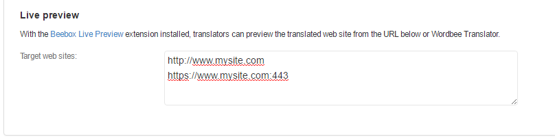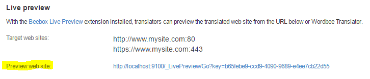 Live Preview adds a web site to your Beebox installation. By opening this web site in a web browser you or linguists can navigate the original site with texts replaced by your translations.