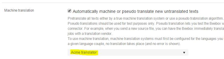 A pseudo translator is a piece of code that "translates" text in an automated manner. For example, it may convert all source text to upper case, inject special characters or make the translation longer or shorter. Such approaches are commonly used by software localization teams during development and testing. They are also useful to simply test Beebox translation workflows without having to resort to real translators or (slower or cost incurring) machine translation.