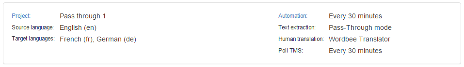 The top pane displays name, languages and workflow information. In the example below, the workflow checks every 30 minutes for new data to exchange with Wordbee Translator: To send new or changed source files, to receive translated files and other.