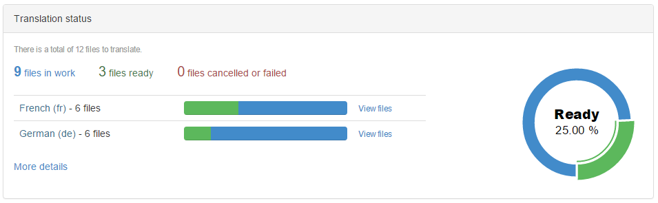 The central pane shows translation status of all source files individually per target language. In the example below we see that some French and German translations are completed ("Ready").