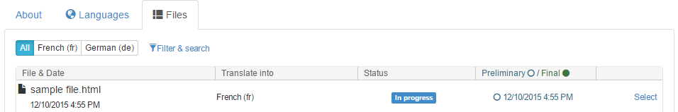 We have added sample file.html to our Beebox project. The status is In progress and this means that the file has been sent into Wordbee Translator.