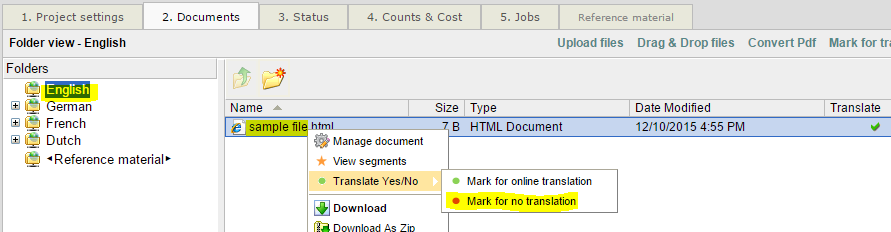 - Mark the document for "no translation". Go to the documents explorer, right click the file and choose "No translation":