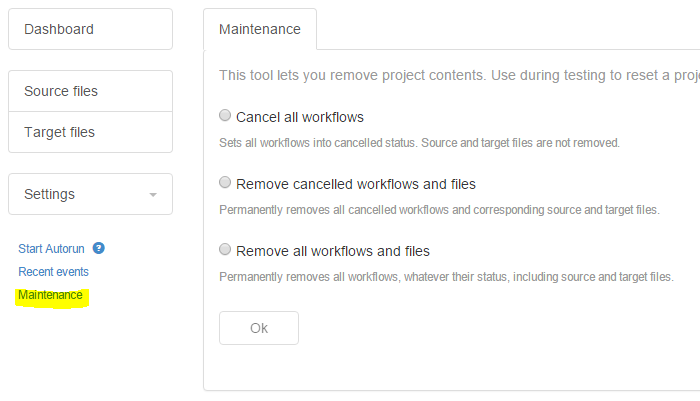 The project maintenance page lets you quickly delete project files or cancel all workflows.
