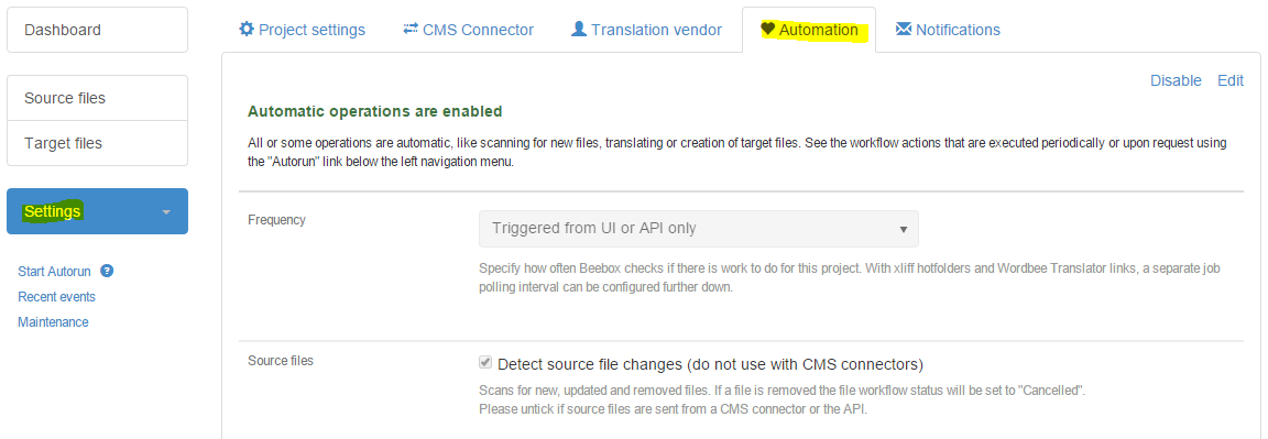 The Automation features of Beebox are among the most exciting. While you can control each translation workflow step manually with the user interface, you can also automate some or even all operations. This includes operations such as detecting new source file, machine translation, creating new human translation jobs, exchanging jobs with translators or a TMS and creation of translated files.