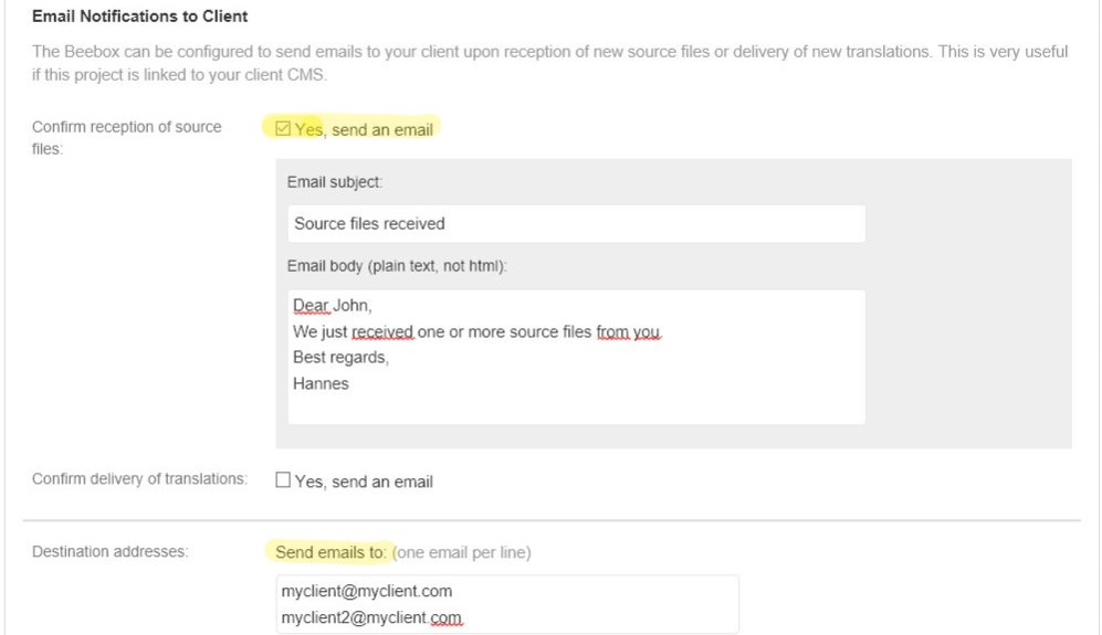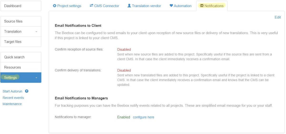 Beebox can send email notification with all or selected events. We distinguish notifications to Beebox managers and notifications to your end customers. The latter can be customized individually per project including message title, body and email addresses.